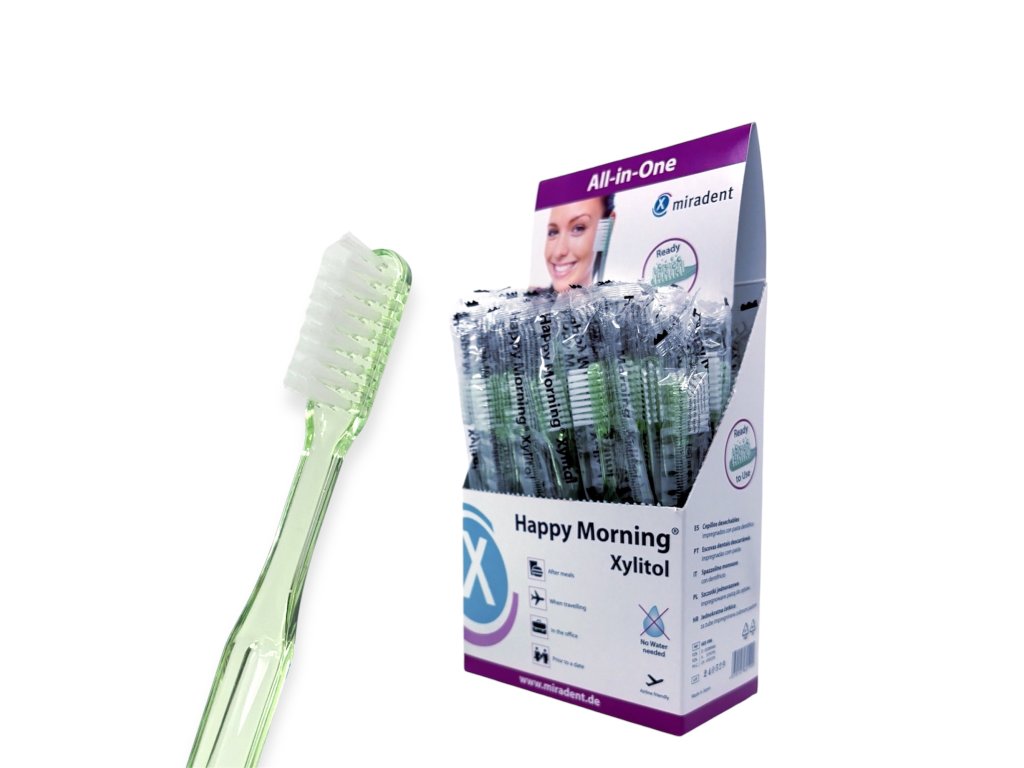 Jednorázový zubní kartáček Happy Morning Xylitol má krátkou hlavici (2,5cm) s měkkými štětinami impregnovanou zubní pastou obsahující xylitol s příchutí čerstvé máty. Xylitol je přírodní náhražka cukru, která brání množení bakterií zodpovědných za vznik zubního plaku. Díky tomu zubní pasta s xylitolem pomáhá chránit zuby a přispívá k prevenci zubního kazu. Ideální pro čištění zubů v zubní ordinaci před ošetřením, po jídle nebo výletech. Box obsahuje 50ks jednotlivě balených zubních kartáčků