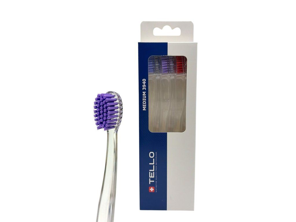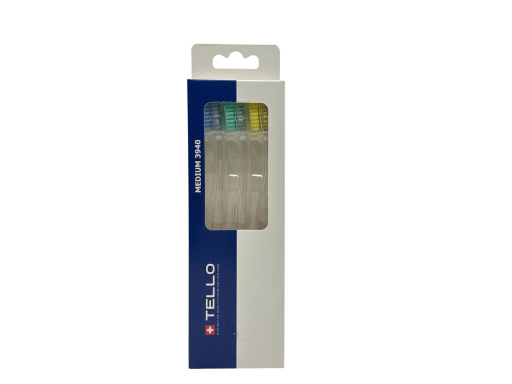 TELLO 3940 Medium je středně měkký zubní kartáček, 3940 vláken o průměru 0,15 mm efektivně a zároveň šetrně odstraňují zubní plak. Má oválnou hlavu, kterou se jednoduše dostanete i do hůře přístupných míst, ergonomická rukojeť má oválný tvar, je vyrobena z průhledného PET s barevnými vlákny. Je vhodný pro zuby a dásně netrpící citlivostí, šetrně vyčistí zuby a dásně bez podráždění.