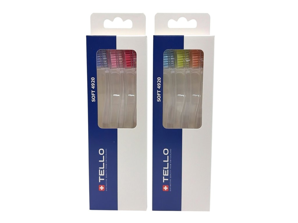 TELLO 4920 Soft je měkký zubní kartáček, 4920 Nollex vláken o průměru 0,12 mm efektivně a zároveň šetrně odstraňují zubní plak. Má oválnou hlavu, kterou se jednoduše dostanete i do hůře přístupných míst, ergonomická rukojeť má oválný tvar, je vyrobena z průhledného PET s barevnými Nollex vlákny. Je vhodný pro zuby s malou citlivostí, šetrně čistí zuby a dásně bez podráždění.
