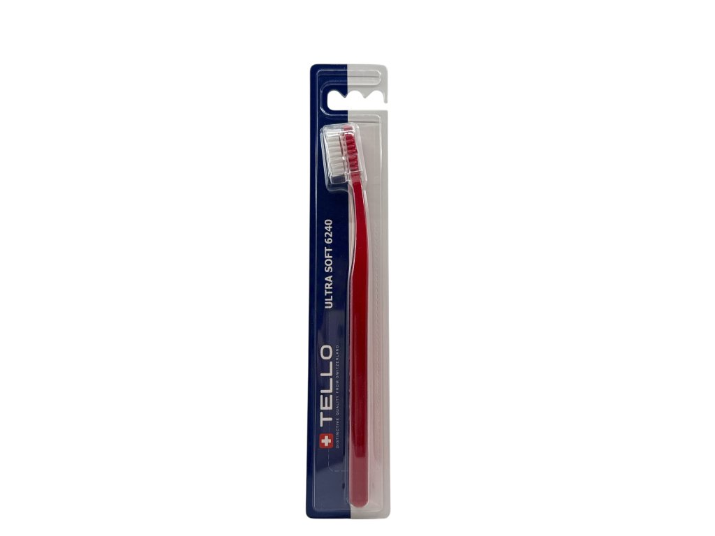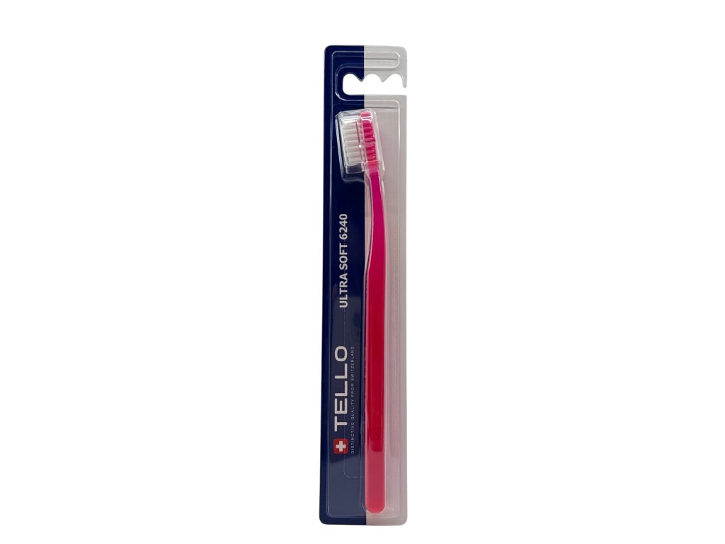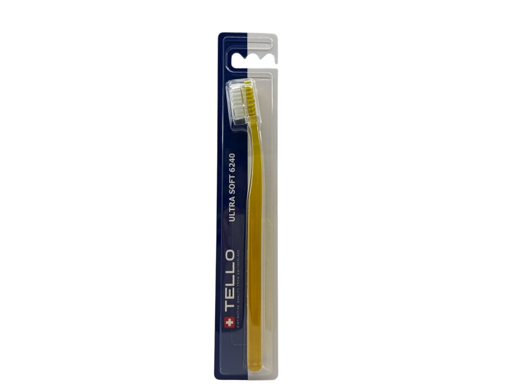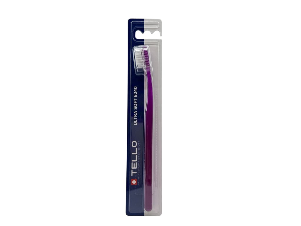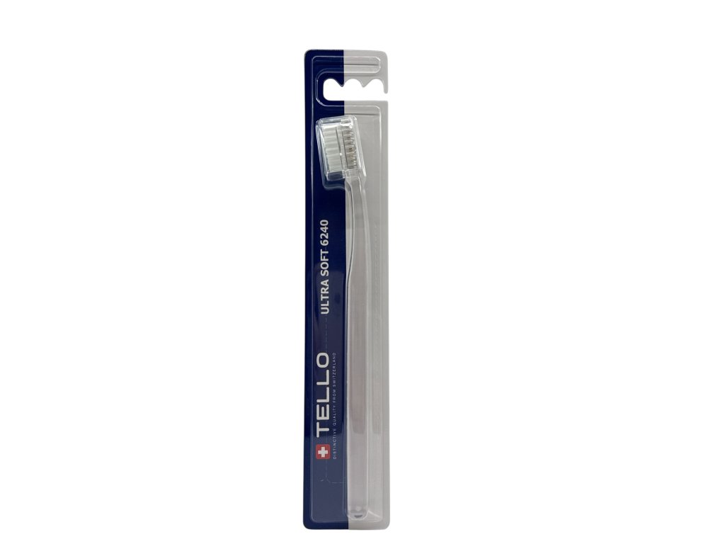 TELLO 6240 Ultra Soft je ultra jemný zubní kartáček, 6240 vláken o průměru 0,10 mm efektivně a zároveň šetrně odstraňují zubní plak. Má oválnou hlavu, kterou se jednoduše dostanete i do hůře přístupných míst, ergonomická rukojeť má oválný tvar, je vyrobena z průhledného PET v 6 různých barvách s bílými vlákny. Je vhodný pro velmi citlivé zuby a dásně, šetrně čistí zuby a dásně bez podráždění.